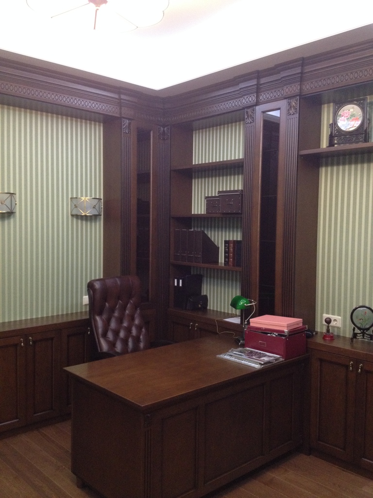 Кабинет изготовлен по индивидуальному проекту заказчика. Интерьер кабинета выполнен в классическом стиле — это геометрия правильных линий и стандартных форм. Использовалась натуральная древесина- массив дуба. В проект вошли не только книжные шкафы и письменный стол, но и стеновые панели, радиаторные решетки, резные колонны, резной багет и декоративные галтели, которые служат маскировкой стыка потолка и стен.