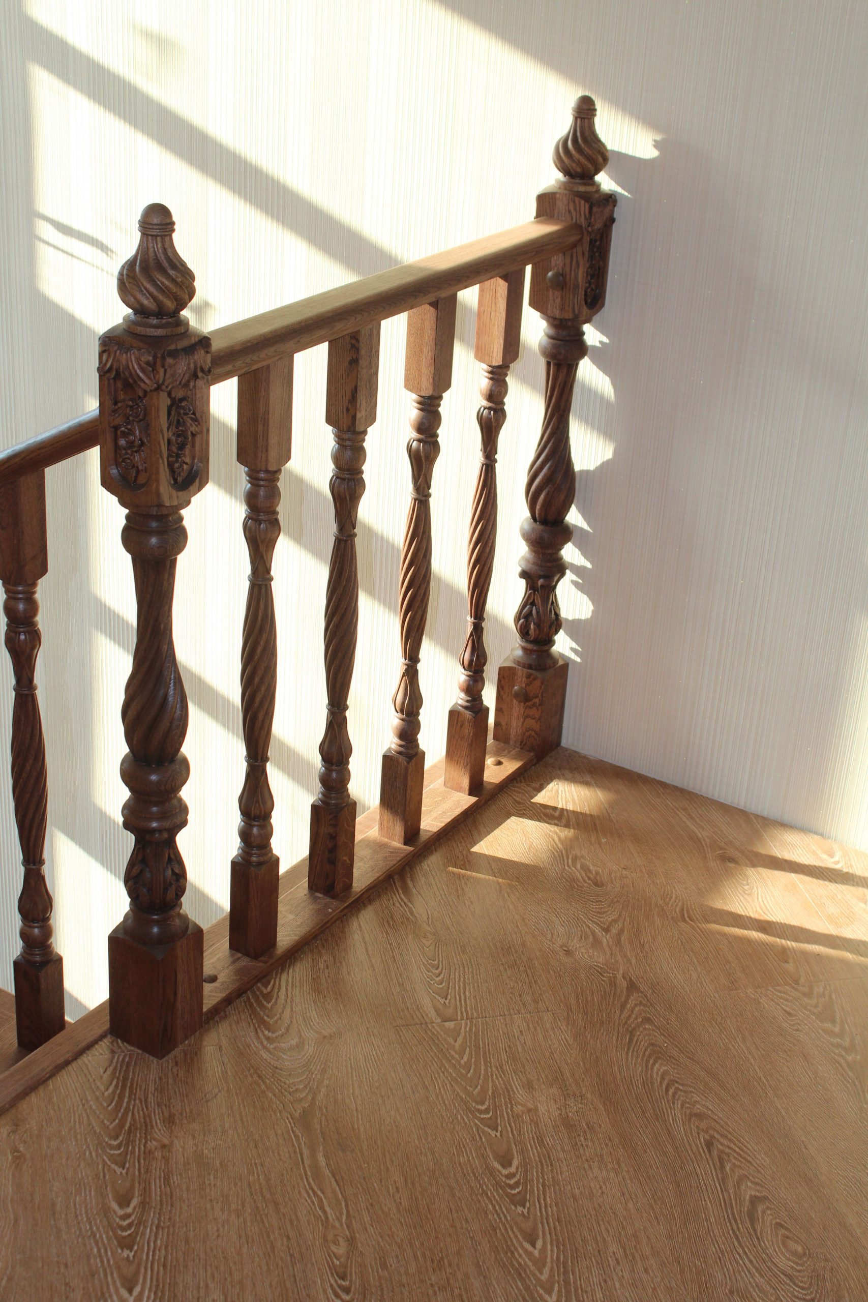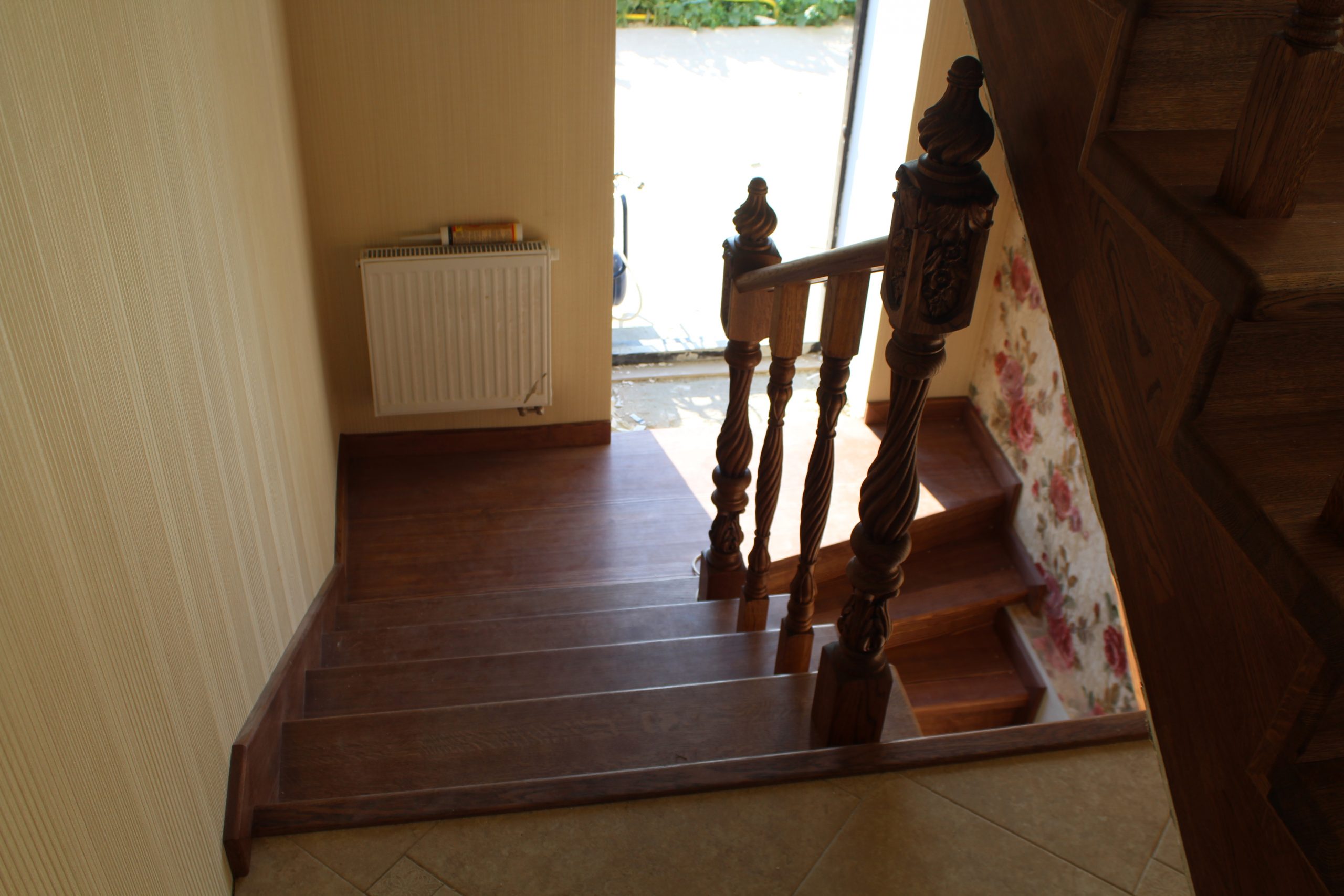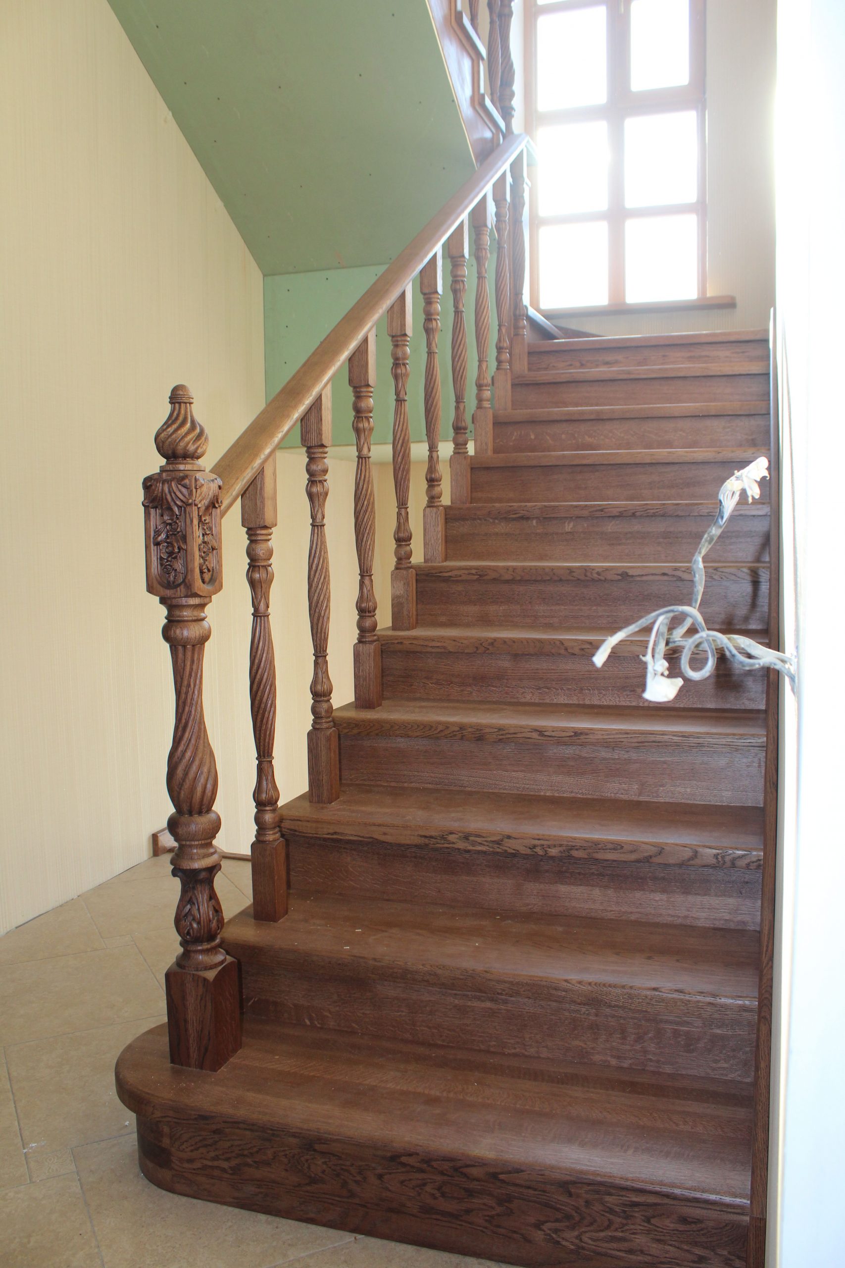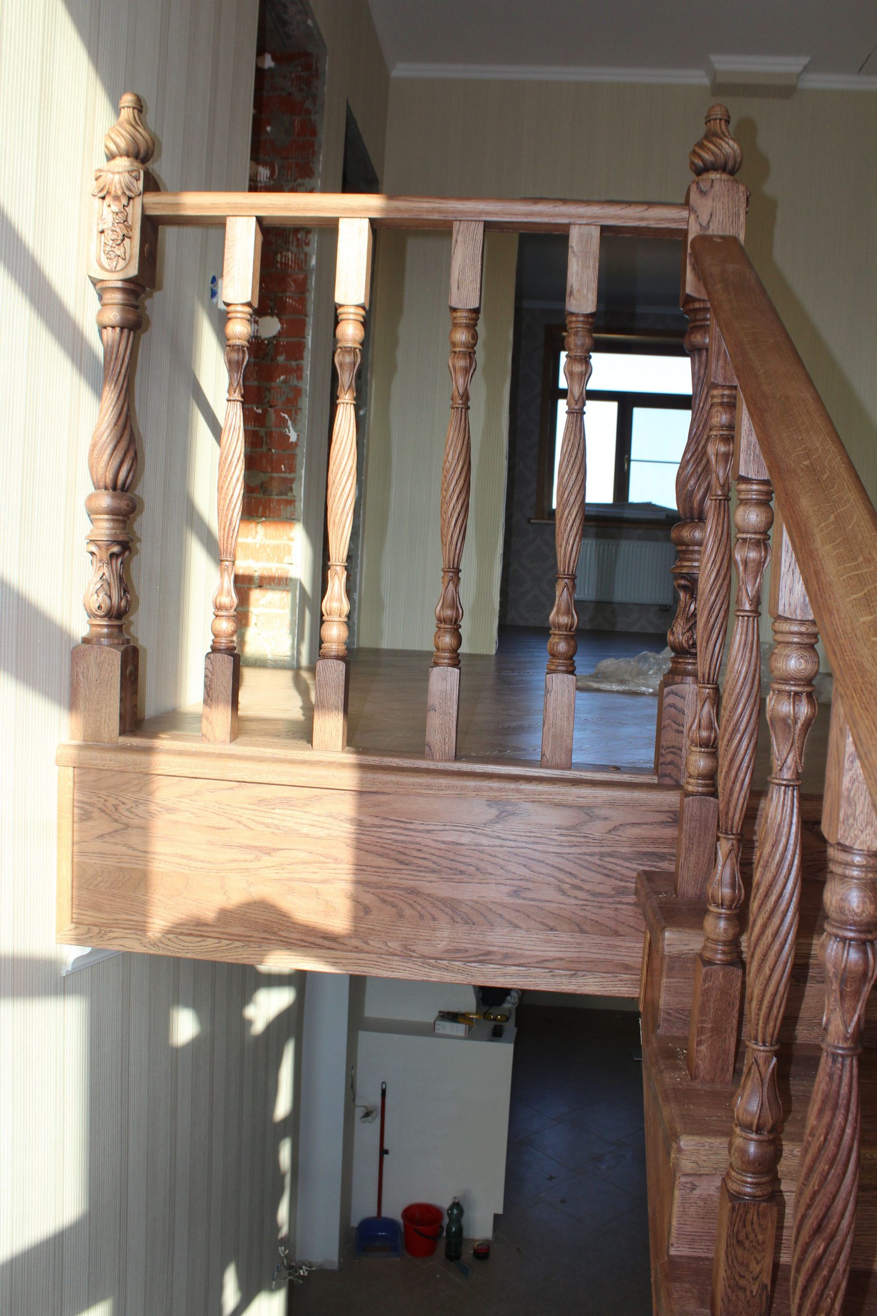 Лестница выполнена на металлическом каркасе с межэтажной площадкой.